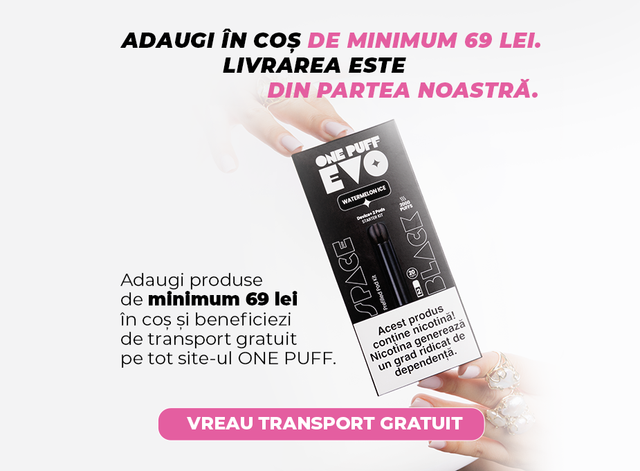 Adaugi produse de minimum 69 lei în coș și beneficiezi de transport gratuit pe tot site-ul ONE PUFF. Campania se desfășoară exclusiv online până pe 23.03.2026 și nu se cumulează cu alte oferte sau promoții.