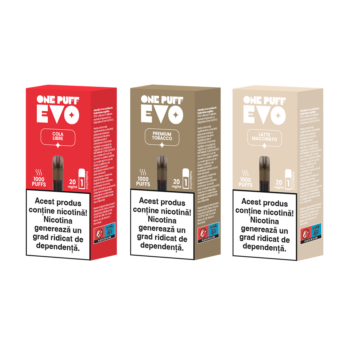Classic Pack conține 3 capsule cu arome Evo: 1x Premium Tobacco, 1x Cola Libre, 1x Latte Macchiato.